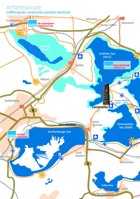 AnfahrtSie erreichen die Landmarke über die B96 Abzweig Kleinkoschen. Folgen Sie dem Bitumenweg bis zum Sornoer Kanal und den Parkplatzeinweisern.