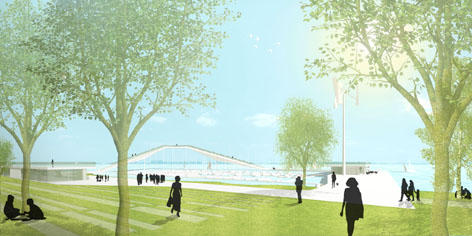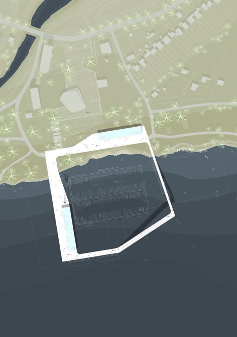 KurzbeschreibungDer Entwurf präsentiert einen Stadthafen, dessen Elemente in einer Hafenanlage in „Loop“-Form eingebunden sind. Einfache Rasenterrassen führen vom Kundenzentrum zum Hafen. Der Strandbereich und das Hafenbecken mit den Anlegestellen sind darin als geschützte Binnenräume integriert. Eine separate Steganlage verbindet die Marina mit dem Ufer. Das Tor zum See bildet ein 17 Meter hoher Bogen. Zudem ist auch die 100 Meter lange und 20 Meter breite Seebrücke Bestandteil der umschließenden Anlage. Sie trägt ein markantes Windrad. An der Uferpromenade befindet sich ein einstöckiges, zu allen Seiten hin verglastes Gebäude mit Dachterrasse, das alle Hafenfunktionen aufnimmt. |