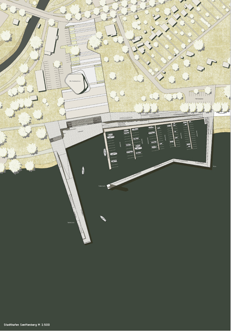 KurzbeschreibungSeebrücke, Promenade und Funktionsgebäude verschmelzen zu einer begehbaren Figur aus Holzbohlen. Das Geländeniveau zur Hafenkante wird als „Entree“ am Platz des bestehenden Kundenzentrums und als Aussichtsterrasse genutzt. Über eine Freitreppe und eine Rampe werden die Seeterrasse und der Hafen miteinander verbunden. Die Hafenanlage ist übersichtlich in drei Bereiche gegliedert und bietet Wasserliegeplätze für Sportboote, im Flachwasserbereich Platz für Wasserwanderer und außerhalb des Hafenbeckens einen Schiffsanleger für Fahrgastschiffe. Ein nachts beleuchteter 12 Meter hoher Aussichtsturm am Ende der Mole ist Landmarke und bildet mit der 150 Meter langen Seebrücke aus Stahlbeton eine Torsituation. Zum Wasser hin verjüngt sich die 17 Meter breite Brücke auf 9 Meter. Sitzgelegenheiten auf der Brücke und im Aufstieg zur Mole laden zum Verweilen ein. Die hafenbezogenen Funktionen werden auf zwei Gebäudekörper verteilt. |