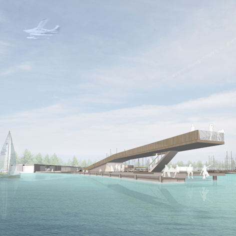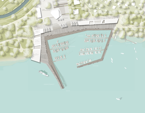 KurzbeschreibungDer Siegerentwurf sieht mit einer 470 Meter langen, schalenförmigen Steganlage eine der längsten Seebrücken Deutschlands vor, die das neue Hafenbecken im Süden des Stadtsees umranden soll. Über Freitreppen wird die Anlage erschlossen. Die Uferpromenade greift die Wege der Parklandschaft auf und bietet Sitzgelegenheiten. Terrassenartige Treppen und Rampen verbinden Steganlage und Promenade. An dieser sind zwei langgestreckte und eingeschossige Funktionsgebäude mit Solardächern in maritimer Architektur angegliedert, welche Raum für ein Restaurant mit Tagungsräumen, Appartments und Ferienwohnungen sowie für hafentypische Nutzungen vom Imbiss und Souvenirverkauf bis hin zum Bootsverleih bieten. Das Hafenbecken sieht fünf Bootsanleger mit rund 120 Wasserliegeplätzen vor. Die Seebrücke fungiert als bauliches Element mit einem eigenständigen Charakter. Ihr Brückenkopf schwebt 5,5 Meter über dem Wasser. Diese Konstruktion aus Holz und Stahl bietet auch Anlegeflächen für Fahrgastschiffe. |
